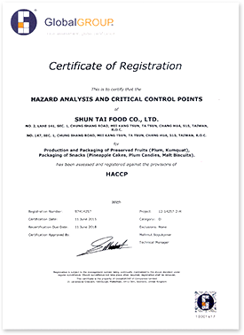 順泰蜜餞(股)公司1984年至1995年連續多次獲得中華民國經濟部頒發的外銷績優廠商的榮耀,並榮獲ISO22000 & HACCP & HALAL國際食品認證,開發不含人工色素及無添加物產品,目前產品品項共103種(含多種水果烘焙果乾),銷售成就凌駕同儕,外銷銷售網廣佈全球,高達27個國家。